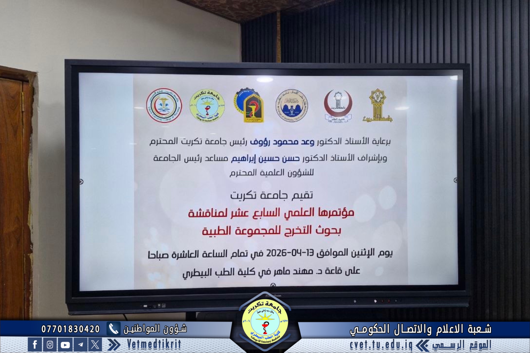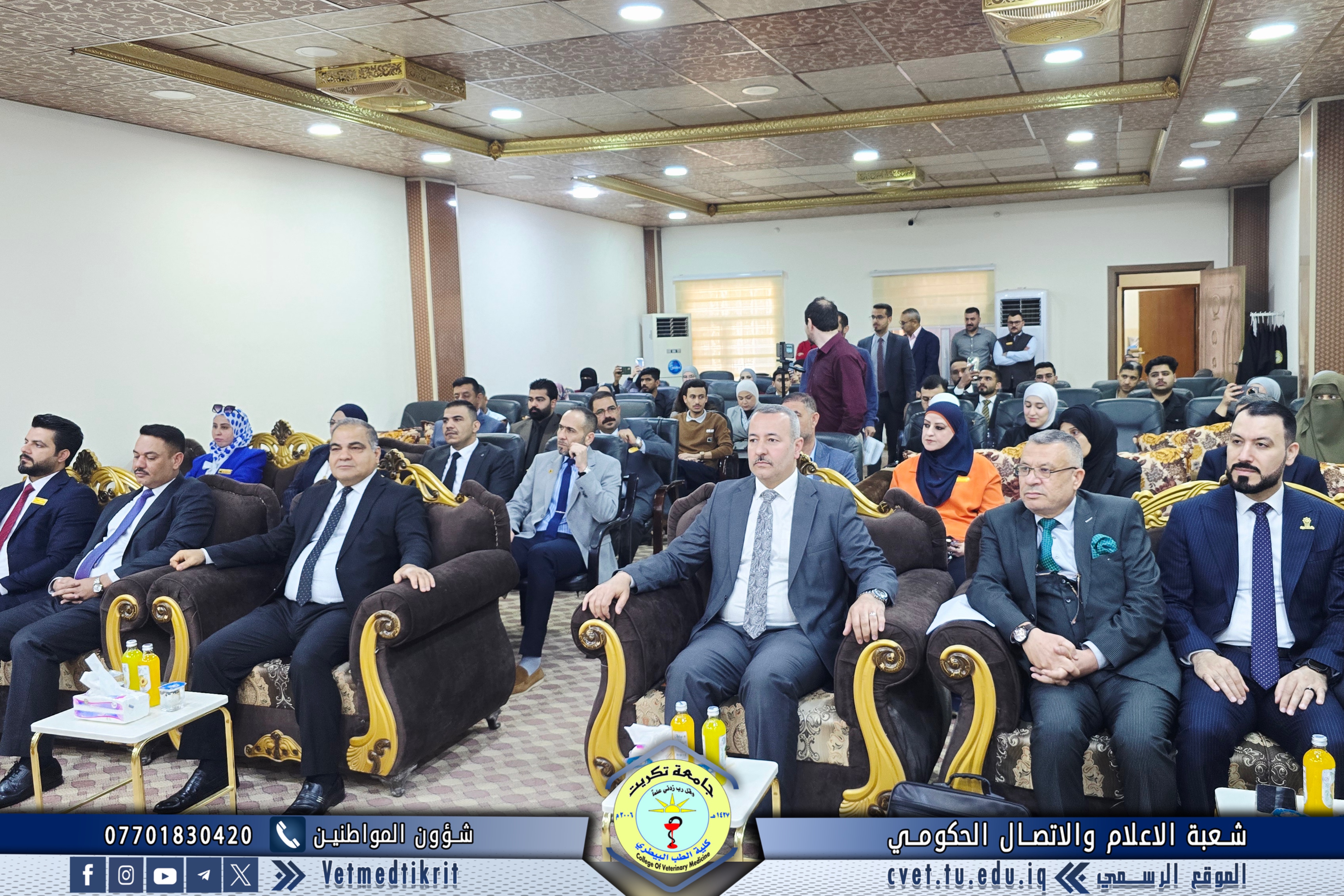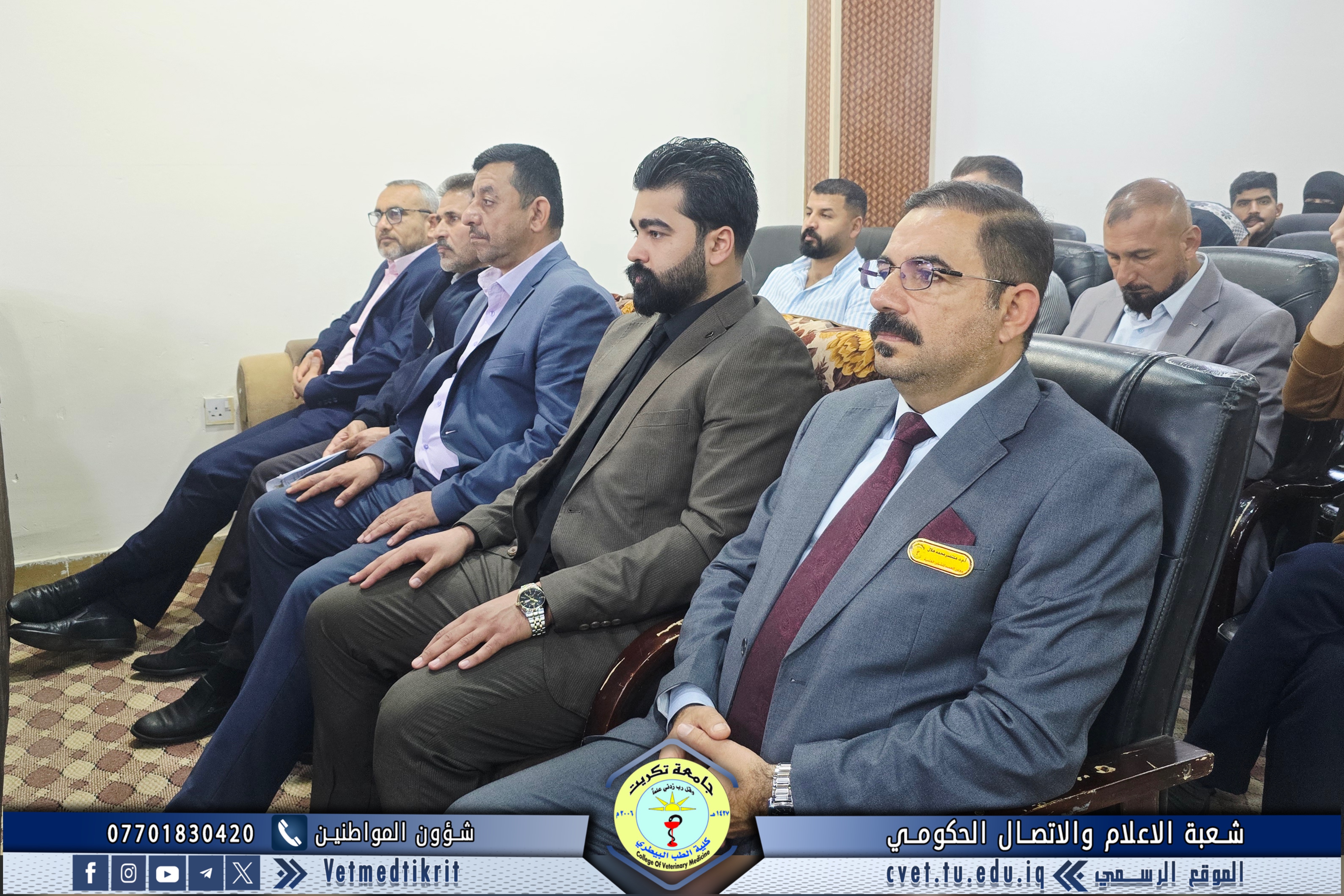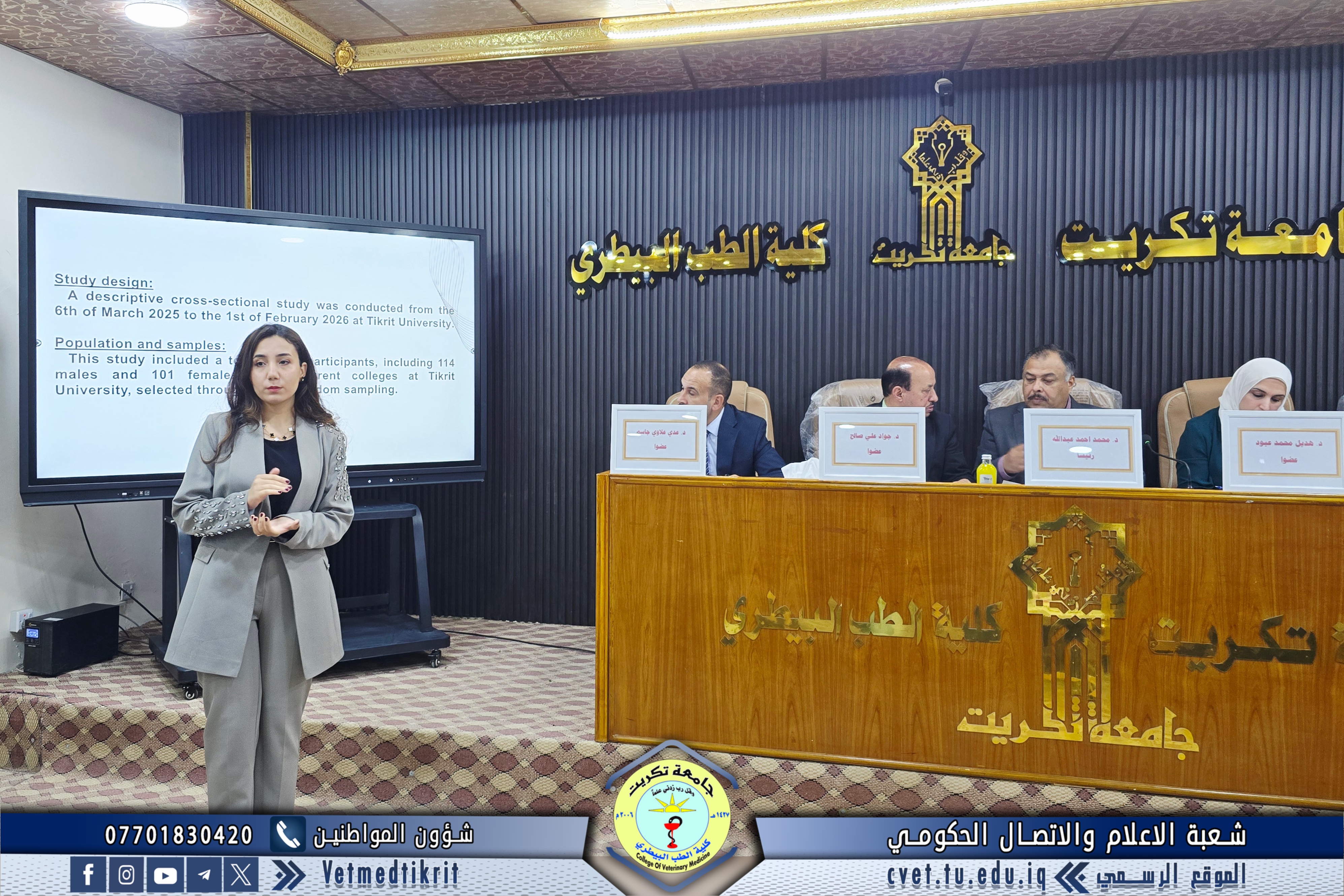 The College of Veterinary Medicine at Tikrit University hosted the activities of the 17th Scientific Conference for discussing graduation research of the medical group, in the presence of Professor Dr. Hassan Hussein Ibrahim, Assistant President of the University for Scientific Affairs, and Professor Dr. Bashar Sadiq Noumi, Dean of the College, under the supervision of Assistant Professor Dr. Montaser Mohammed Hilal, Assistant Dean for Scientific Affairs.