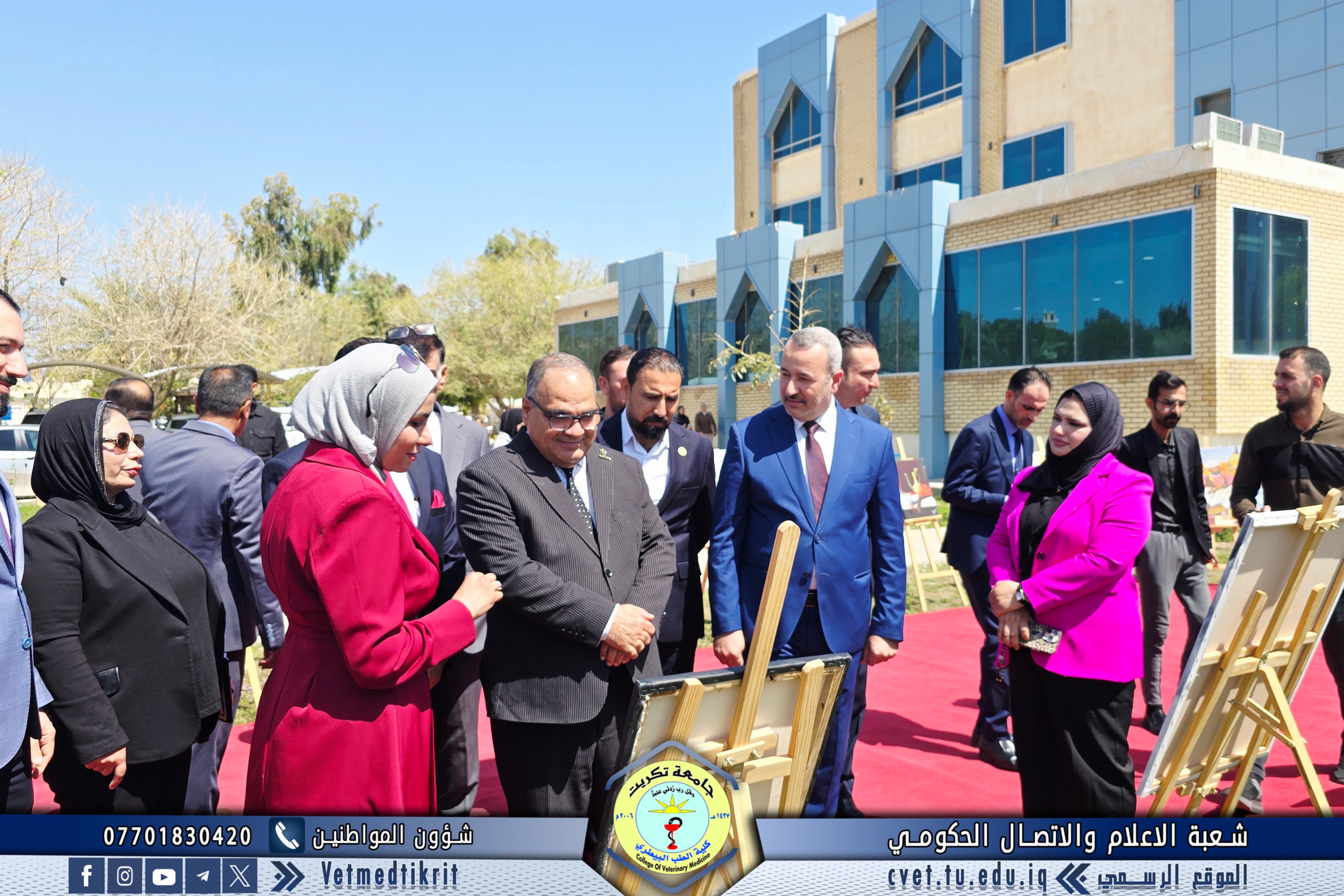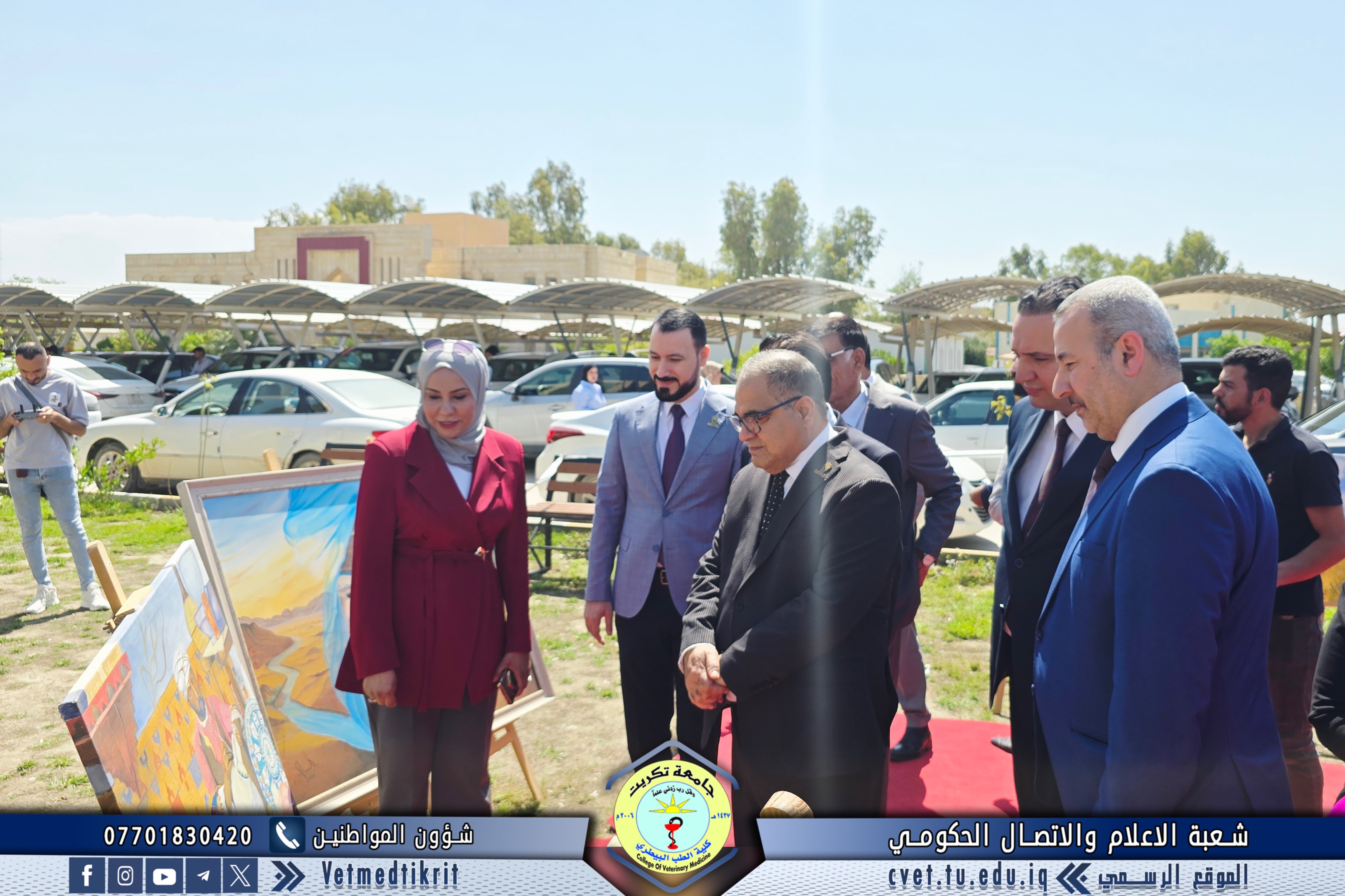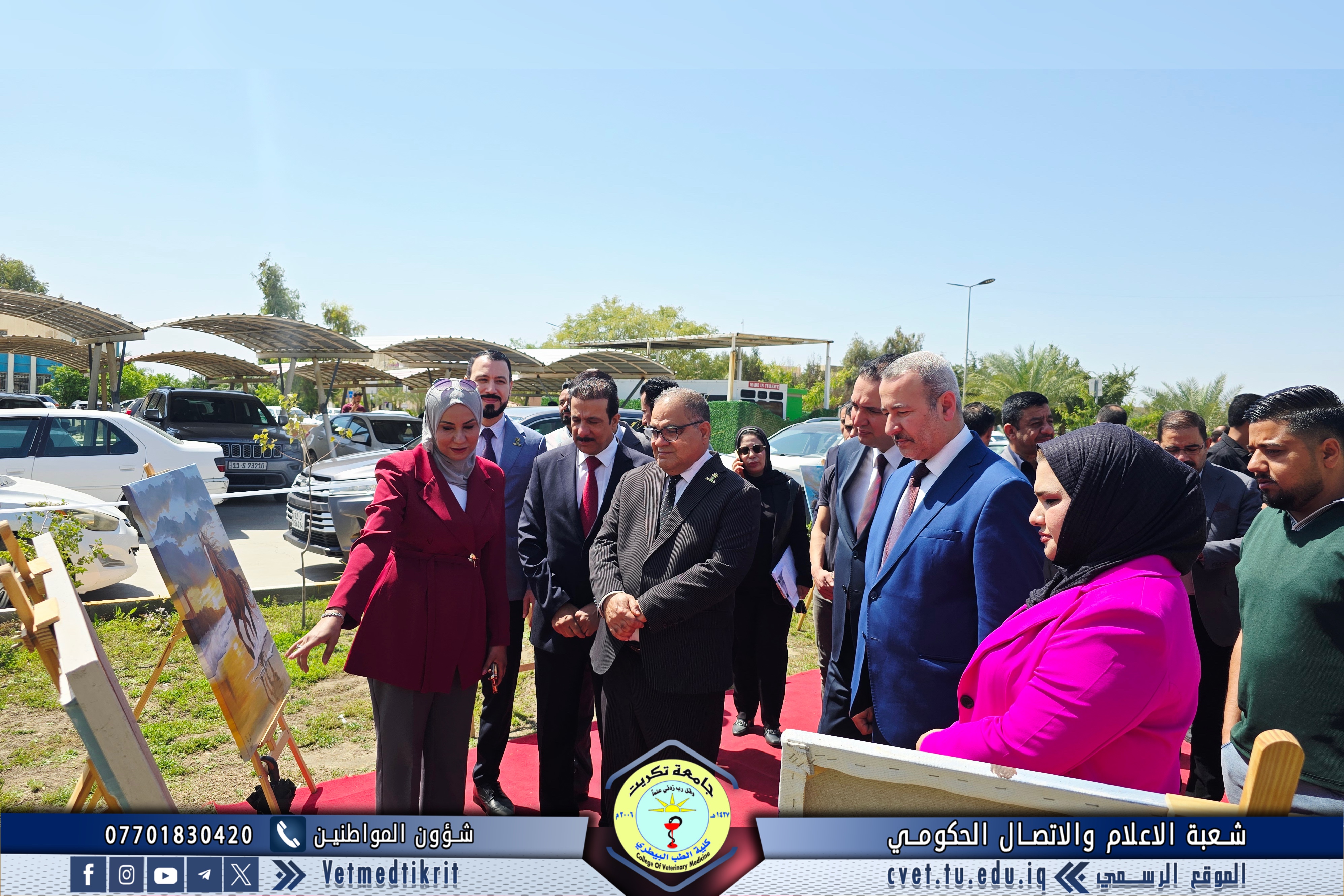 Professor Dr. Omaima Ibrahim Mahmoud, a faculty member at the College of Veterinary Medicine at Tikrit University, participated in an art exhibition organized by the College of Arts. The exhibition was inaugurated by Professor Dr. Hassan Hussein Ibrahim, Assistant President of the University for Scientific Affairs, and attended by Professor Dr. Bashar Sadiq Noumi, Dean of the College of Veterinary Medicine.