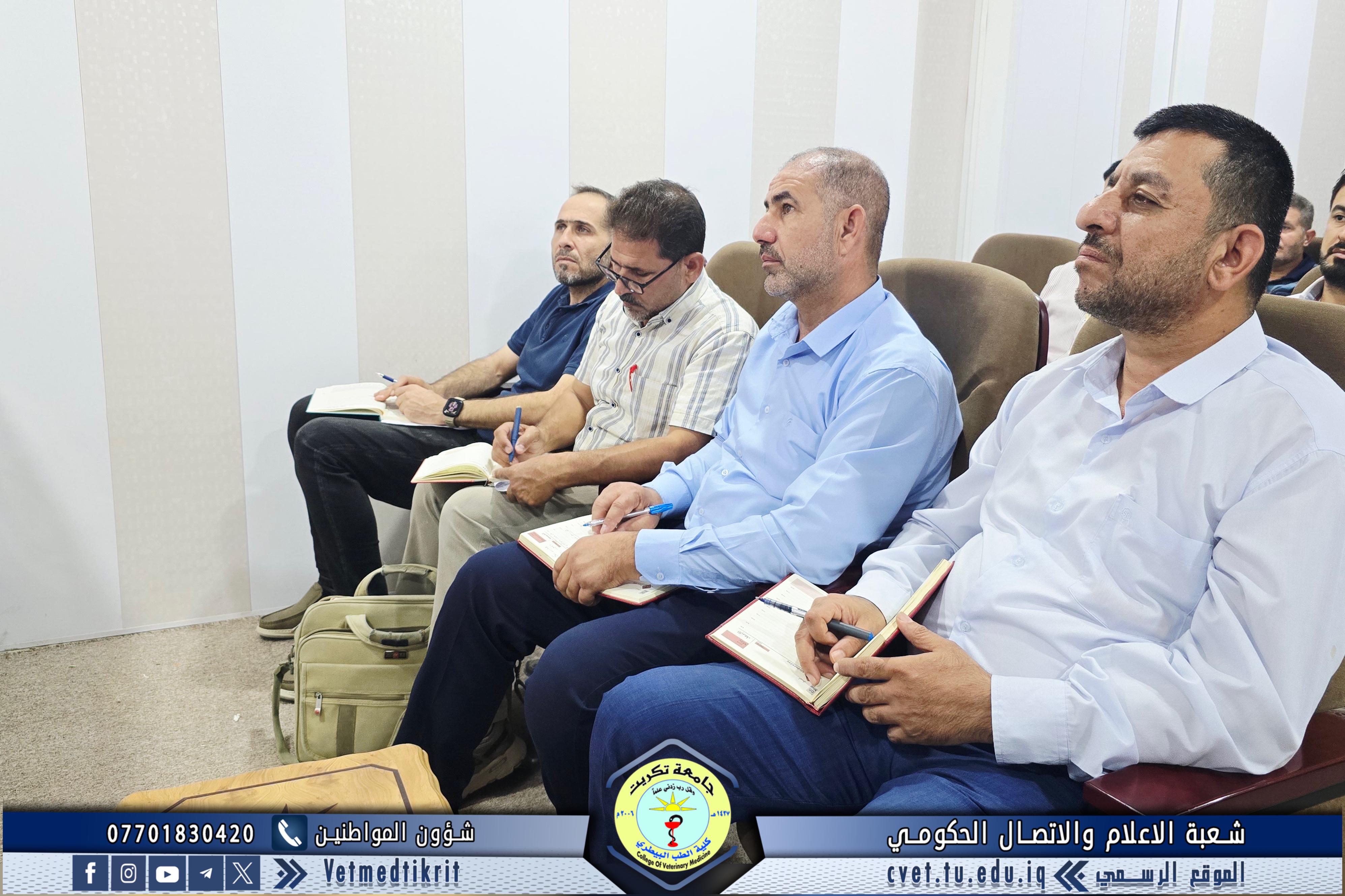 Professor Dr. Bashar Sadiq Noumi, Dean of the College of Veterinary Medicine, chaired an expanded meeting with the heads of academic departments and divisions at the college. The meeting was attended by Assistant Professor Dr. Montaser Mohammed Hilal, Assistant Dean for Academic Affairs; Assistant Professor Saad Sabbar Nassif, Secretary of the College Council; and Assistant Lecturer Montaser Mohammed Neda, Director of the Administrative Affairs Division. The meeting discussed several important topics for the start of the new academic year, most notably: emphasizing commitment to and organization of official working hours; assigning a number of faculty and administrative staff members to tasks in divisions, units, and laboratories; and monitoring administrative and organizational aspects to ensure smooth workflow and achieve the best results. This meeting comes within the framework of the Deanship of the College's commitment to strengthening discipline and improving the level of academic and administrative performance, which will positively impact the college's educational and research progress.