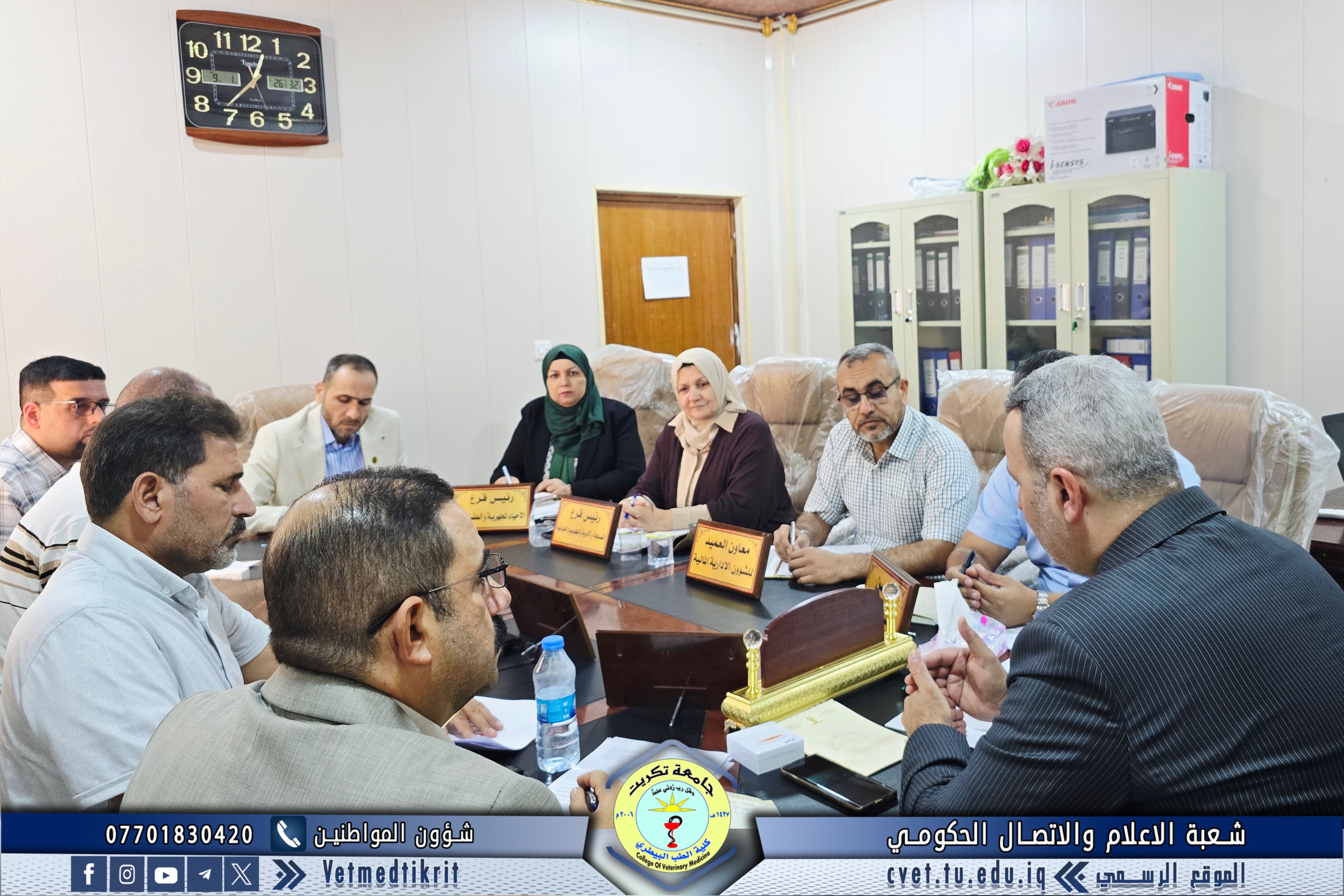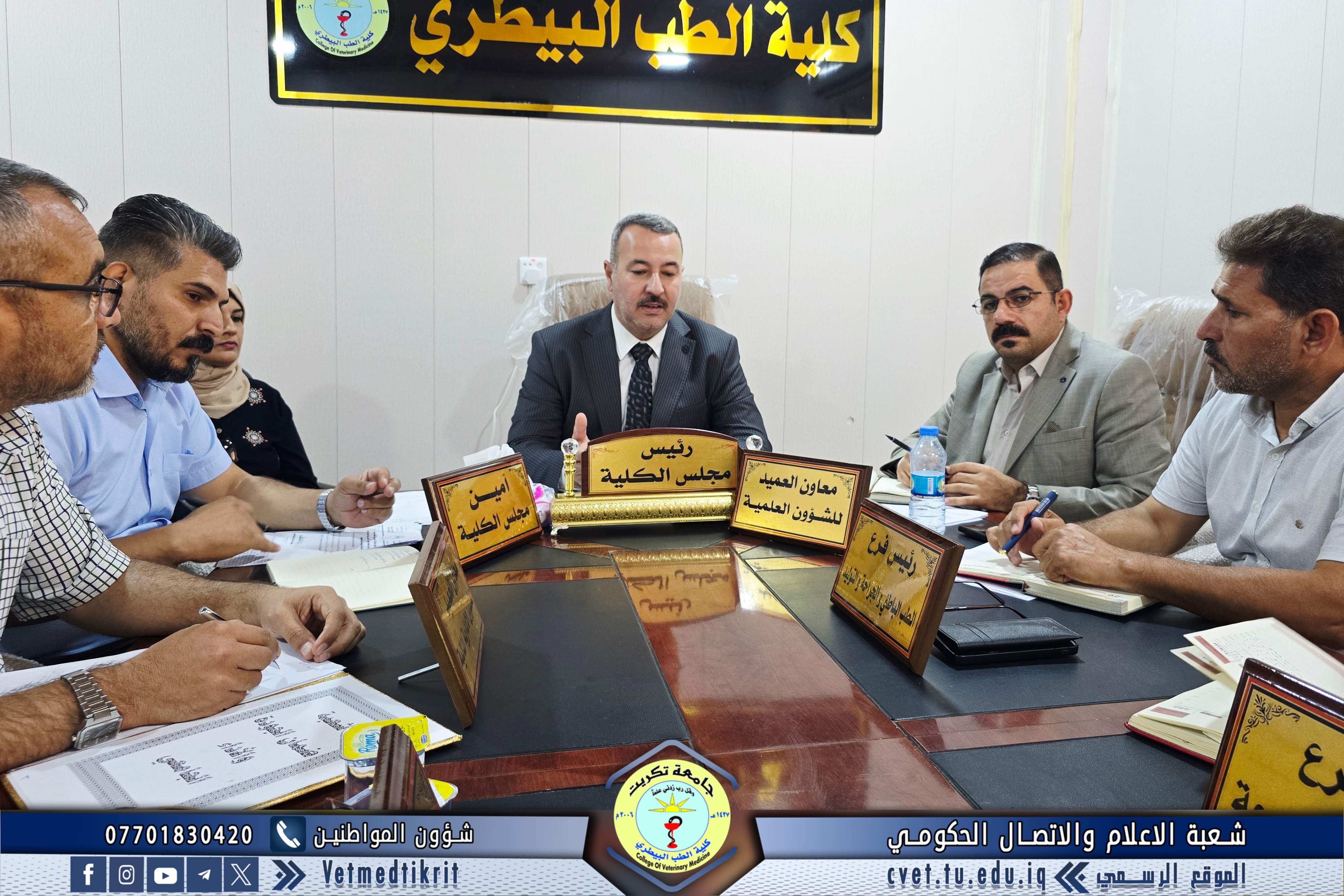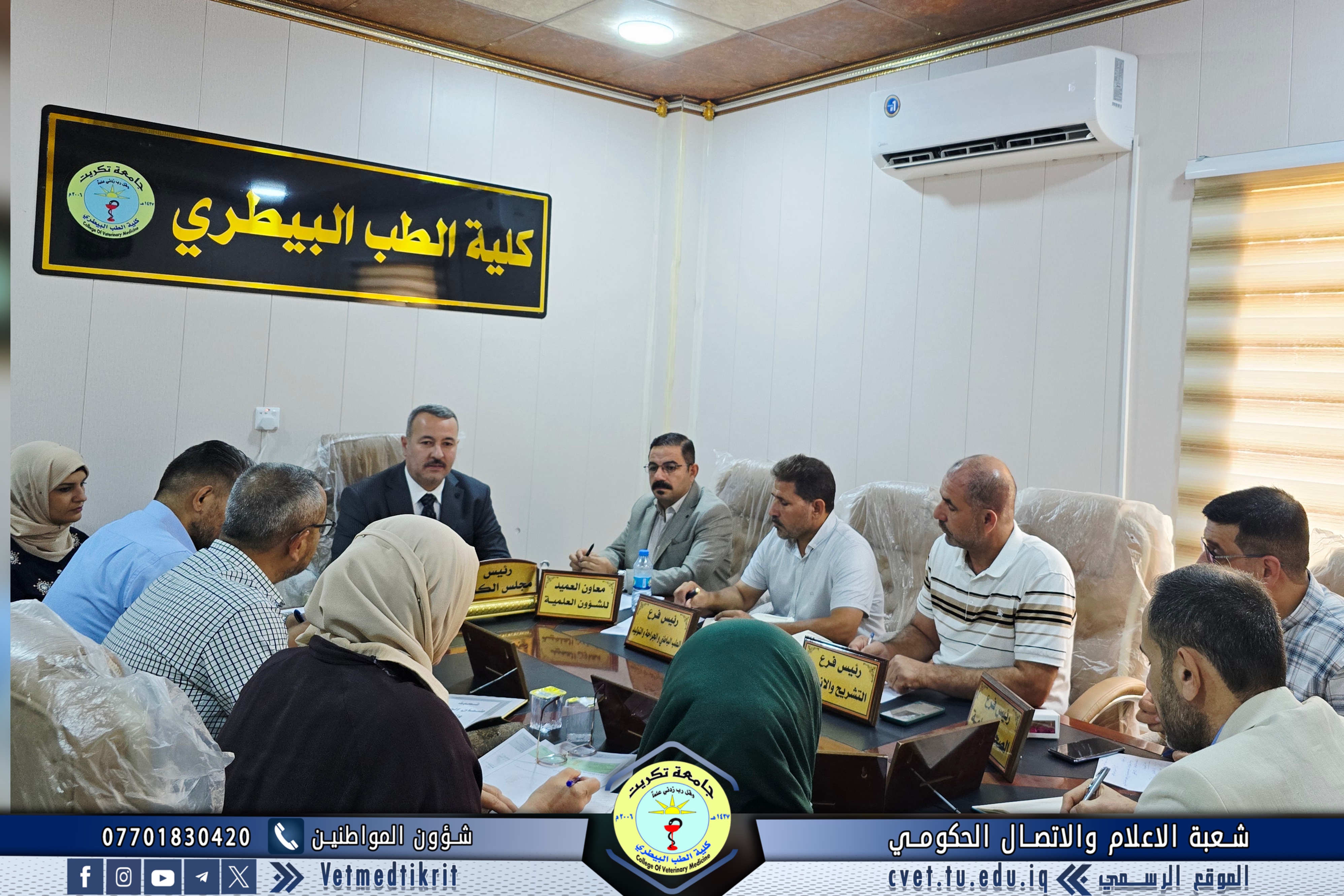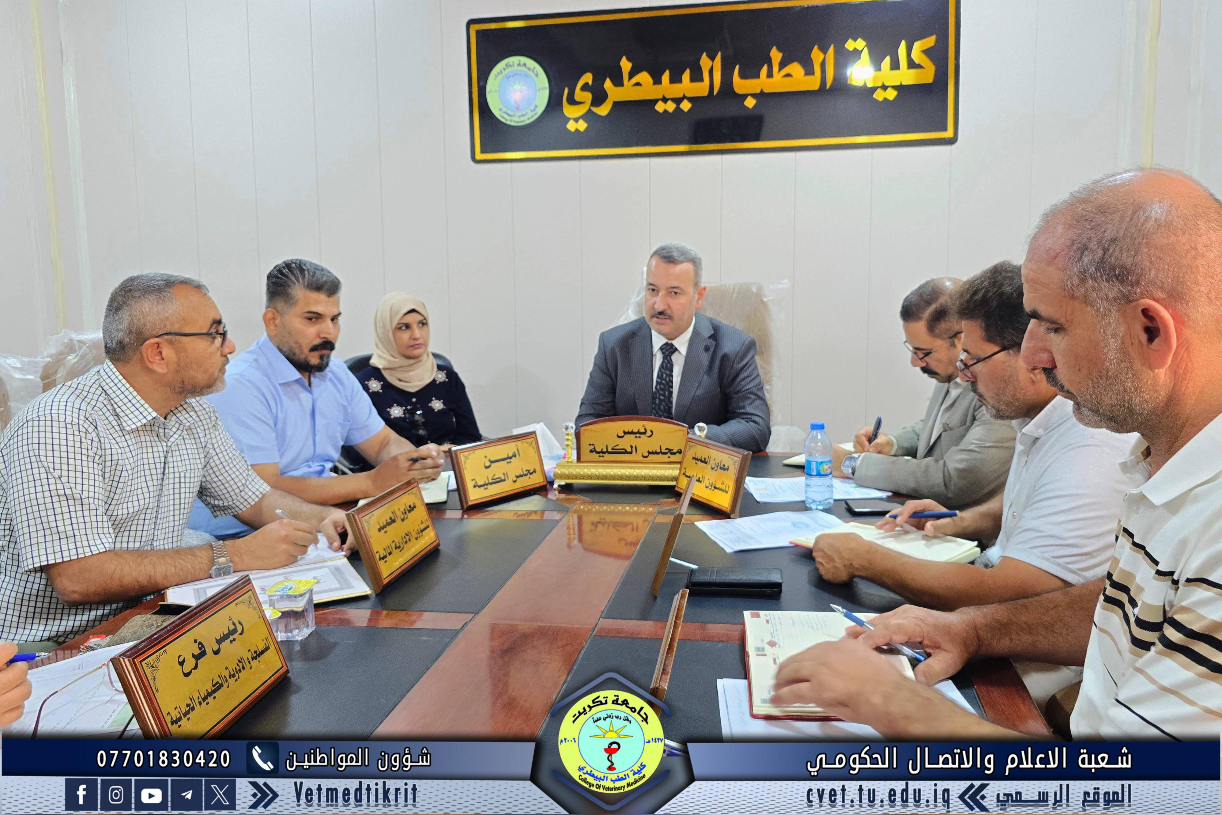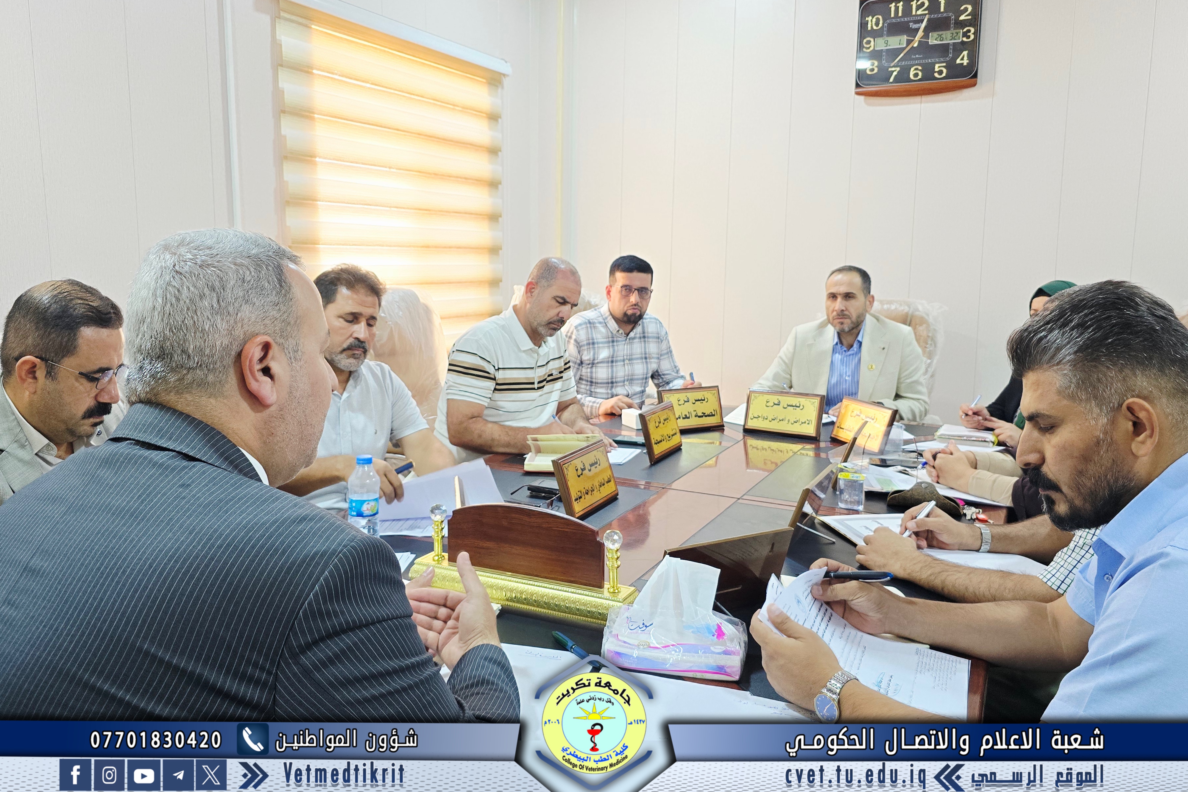 The College of Veterinary Medicine Council at Tikrit University held its first session for the 2025-2026 academic year, chaired by Professor Dr. Bashar Sadiq Noumi, Dean of the College, and attended by the assistants and heads of academic departments. During the session, the Council hosted: Assistant Professor Dr. Ahmed Abdullah Sultan, Director of the Quality Assurance and University Performance Division, and Assistant Professor Saba Hussein Rashid Makhoul, Director of the Bologna Process Management System. At the beginning of the meeting, the Dean welcomed the attendees, wishing them a fruitful academic year. The Council then discussed several issues on the agenda, most notably: the practical application of the final stages, completing the requirements for implementing institutional accreditation standards, and discussing the plan to complete the implementation of the Bologna Process system in the second phase, following the successful implementation of the first phase during the last academic year. The council's convening comes as part of the college's efforts to continue its scientific and academic journey with well-considered steps towards excellence and ensuring quality in educational performance.