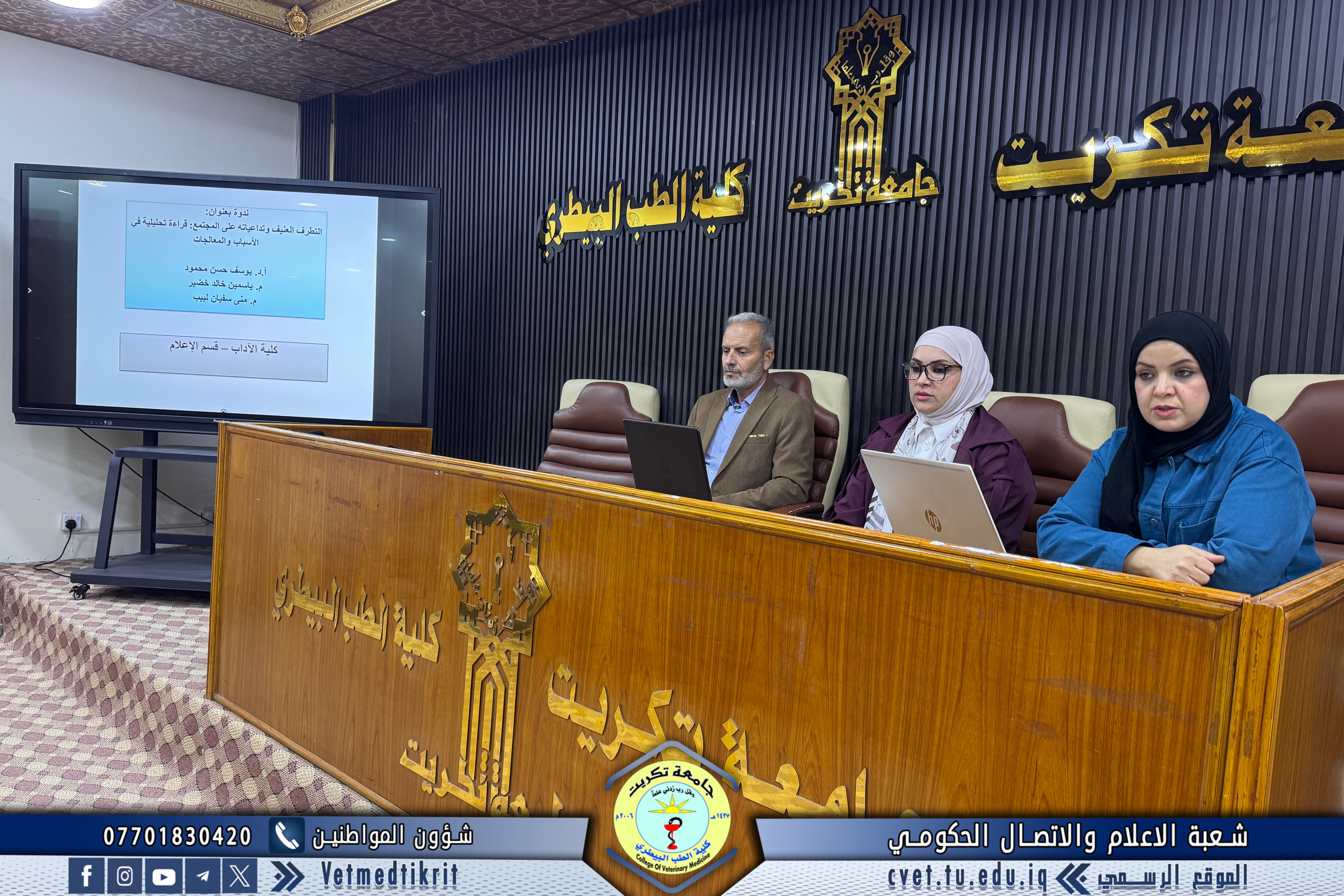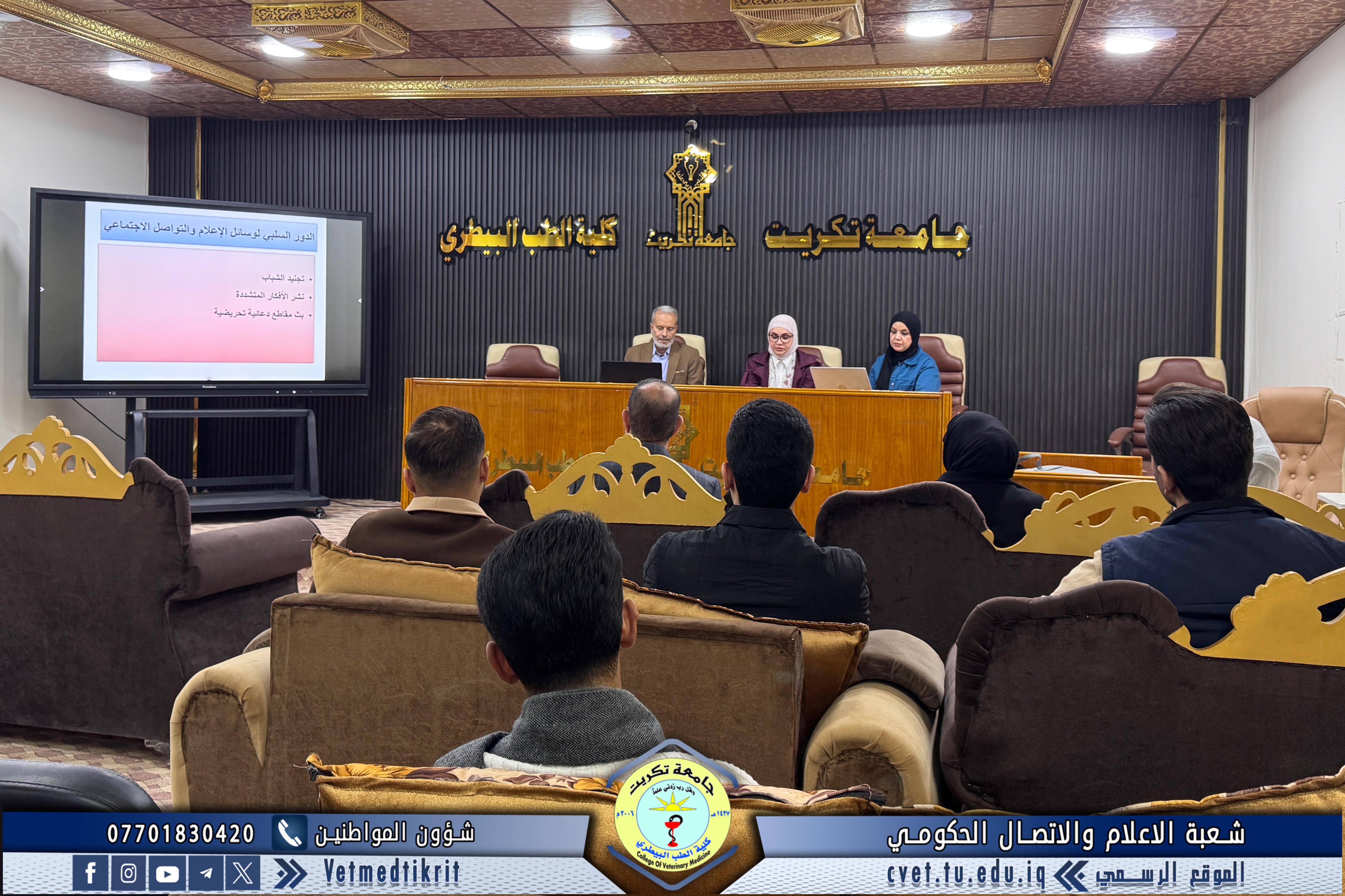 As part of the activities of the Global Entrepreneurship Week, and under the patronage of Professor Dr. Waad Mahmoud Raouf, President of Tikrit University, the Psychological Counseling and Educational Guidance Unit at the College of Veterinary Medicine, in cooperation with the College of Arts, organized a scientific seminar entitled “The Role of Media in Countering Violent Extremism and Reducing Its Impact on Individuals and Society.”