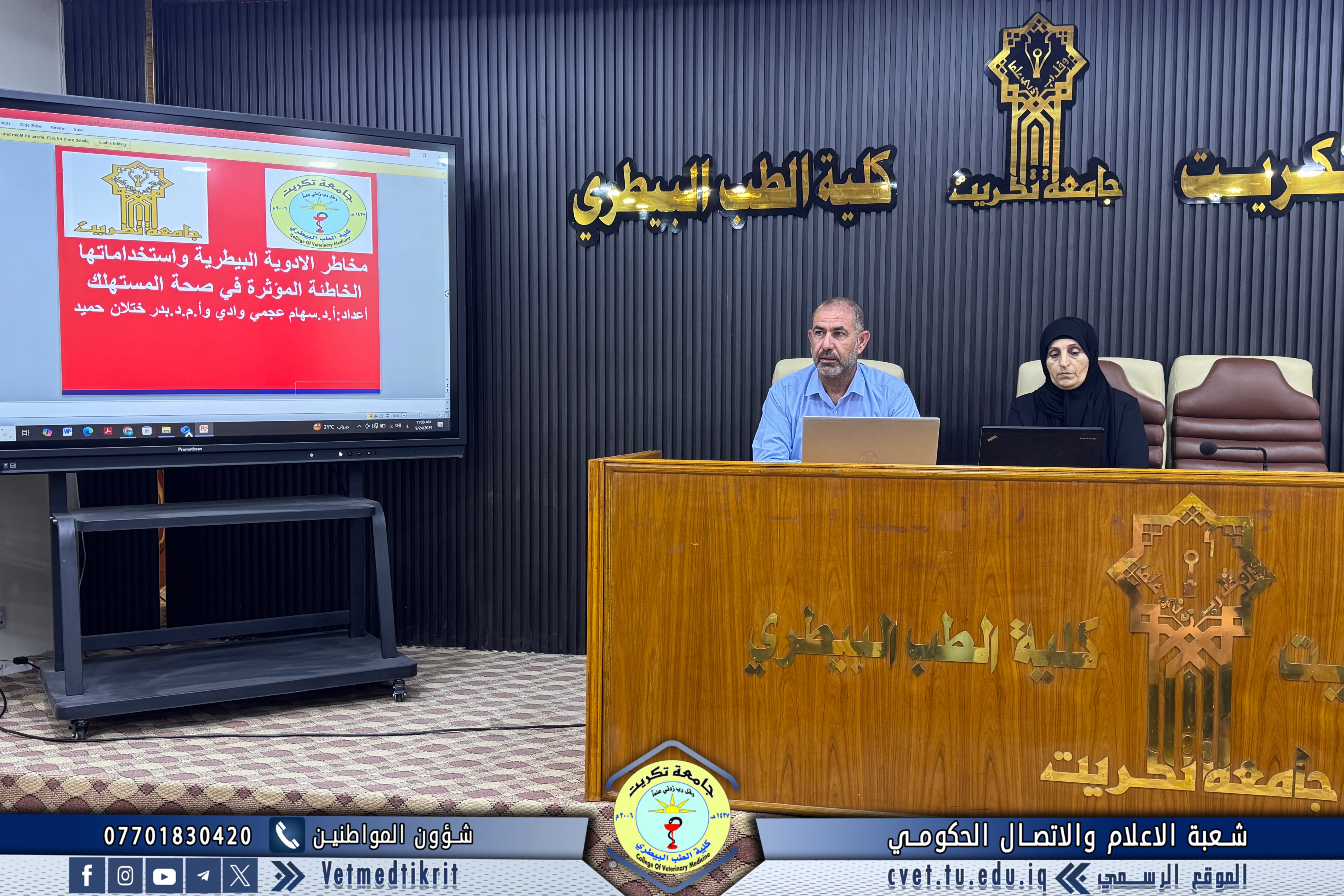 As part of its efforts to promote scientific awareness and encourage the rational use of veterinary medicines, the College of Veterinary Medicine at the University of Tikrit organized a scientific seminar entitled “The Risks of Veterinary Drugs and Their Misuse Affecting Consumer Health.”