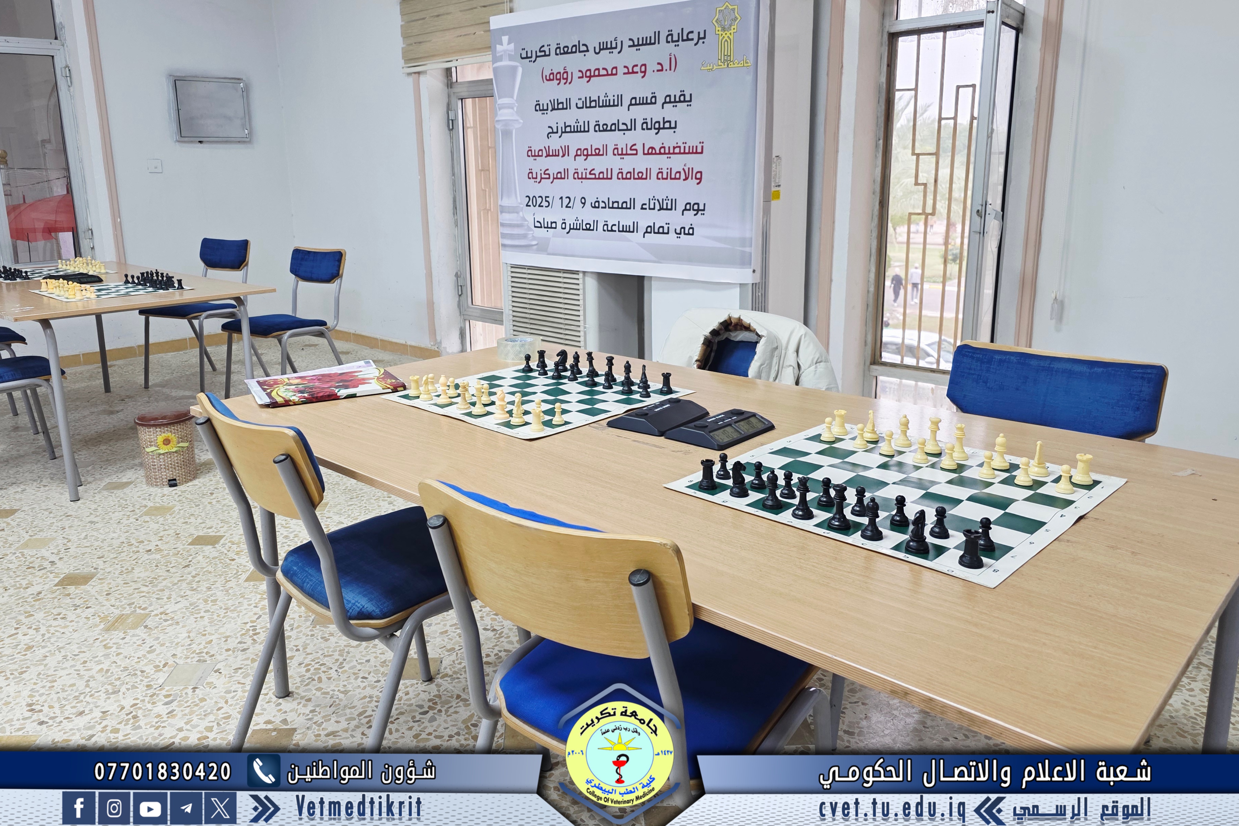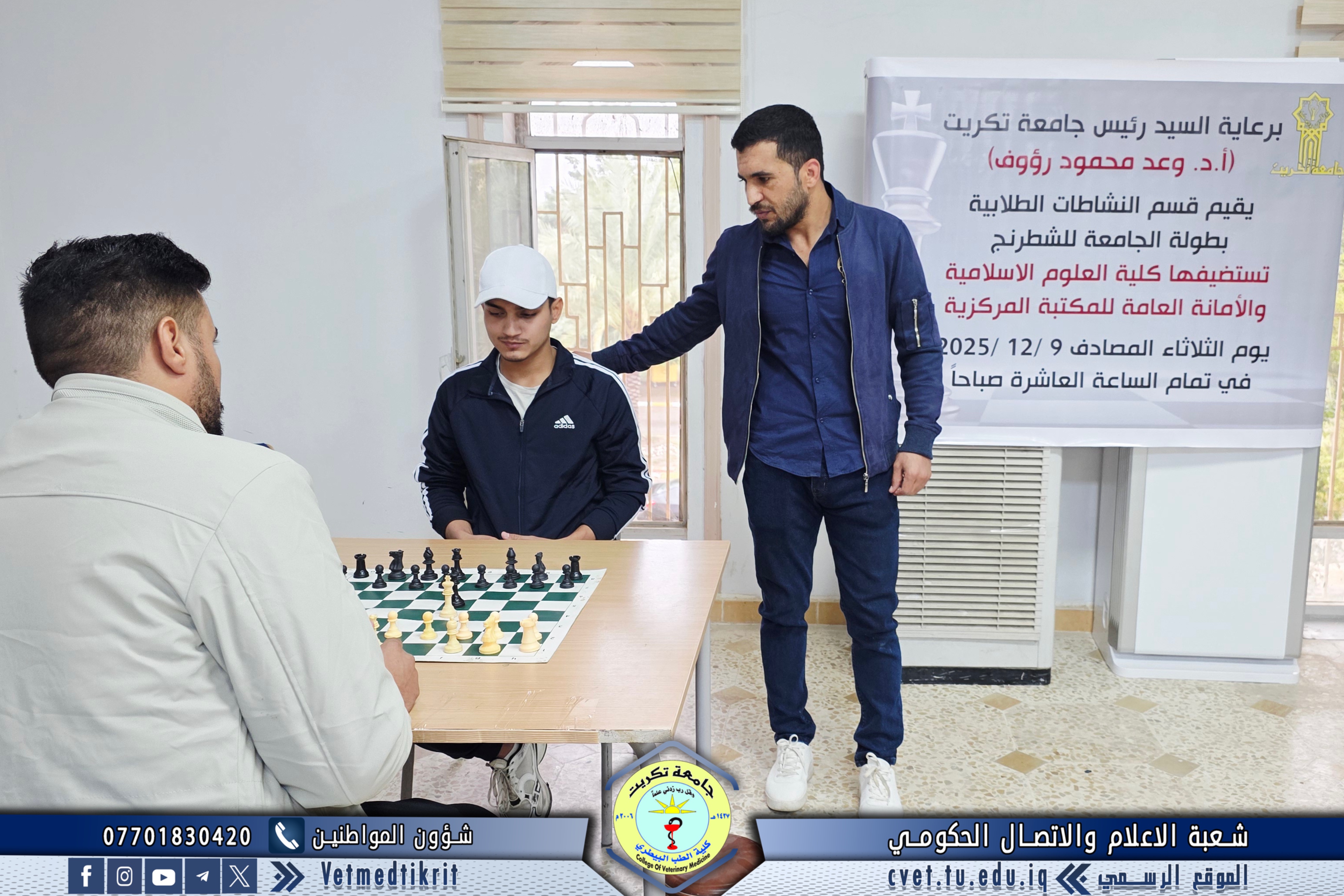 The College of Veterinary Medicine participated in the University of Tikrit Chess Championship, hosted by the College of Islamic Sciences and the General Secretariat of the Central Library. This participation comes as part of the College’s extracurricular activities and its commitment to supporting students across various academic, cultural, and athletic fields.