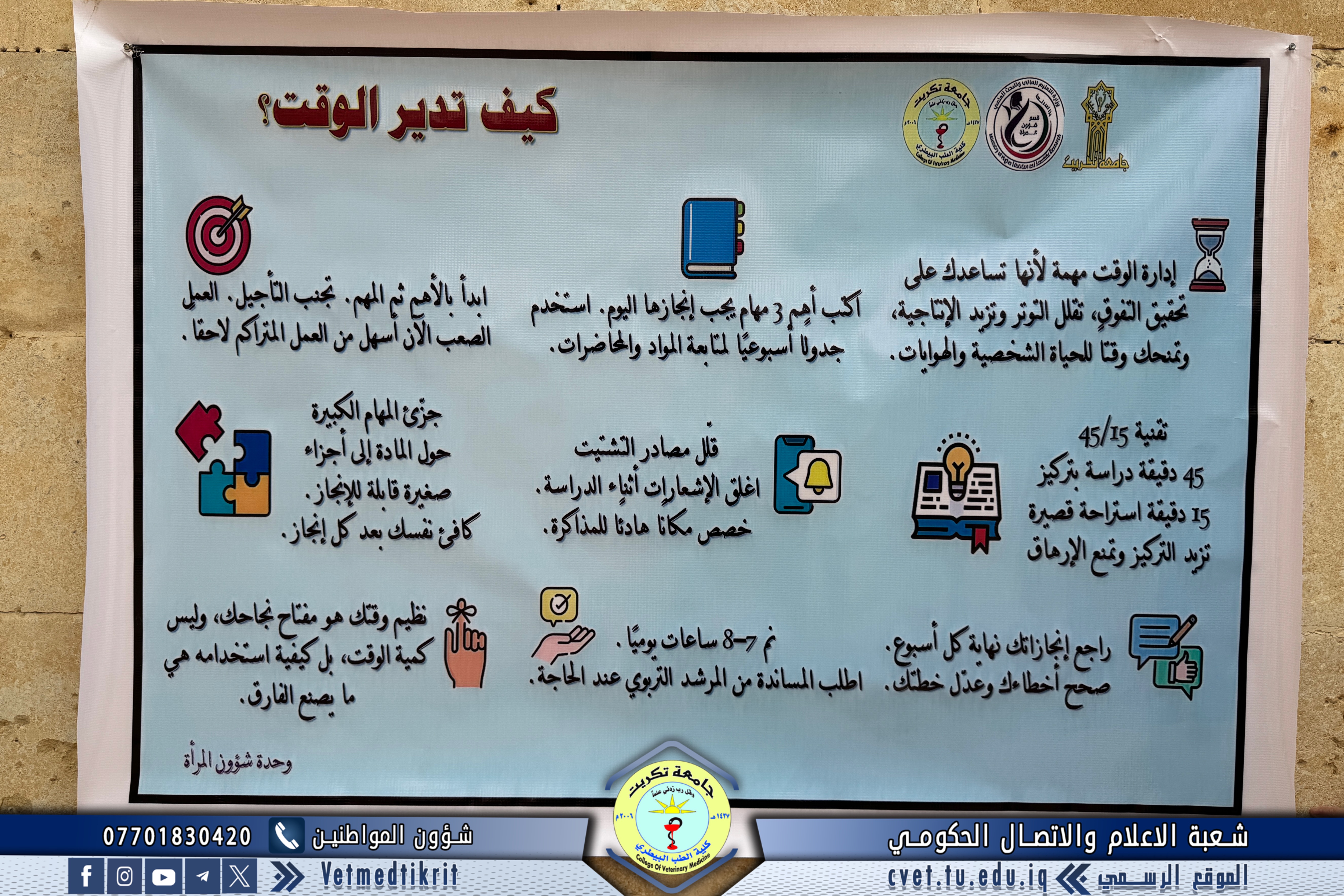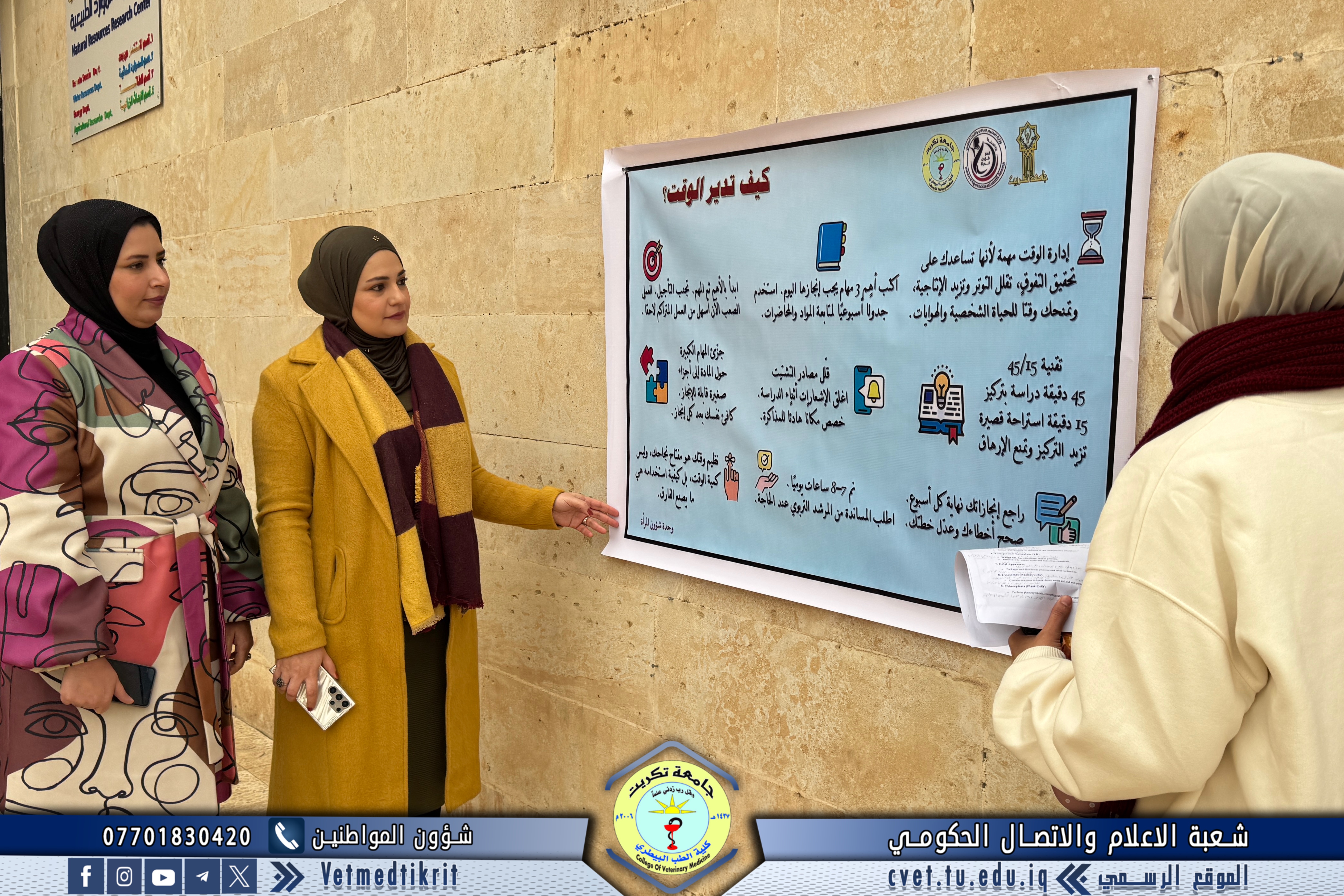 The Women’s Affairs Unit at the College of Veterinary Medicine, University of Tikrit, organized an awareness campaign aimed at enhancing time management skills among the College’s students, as part of its programs designed to provide academic and educational support.
